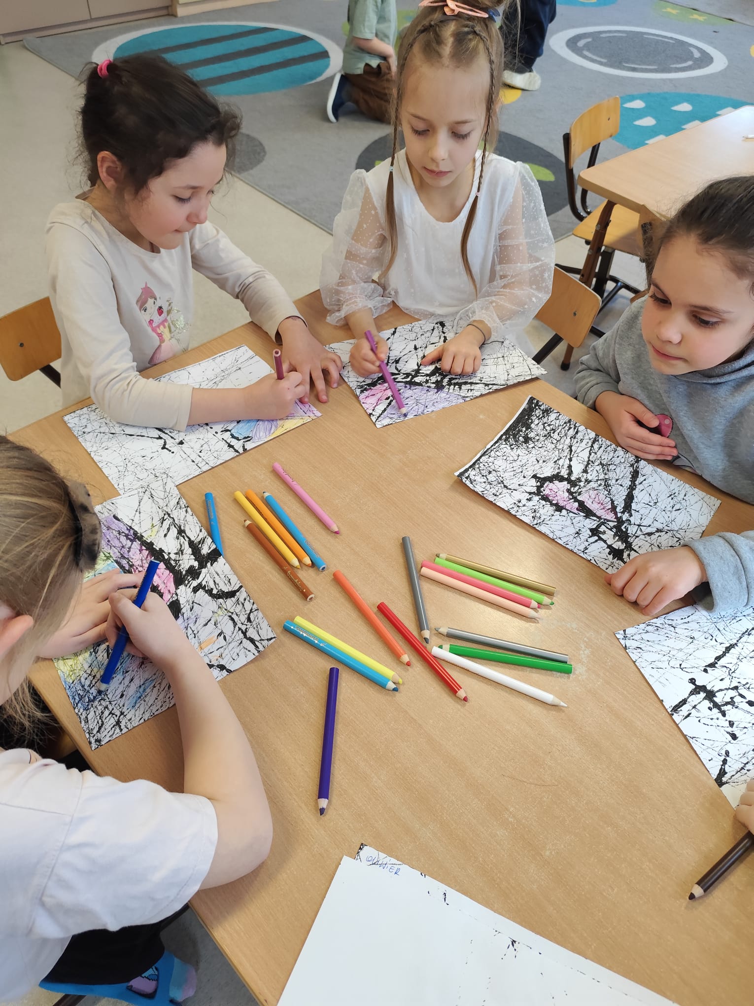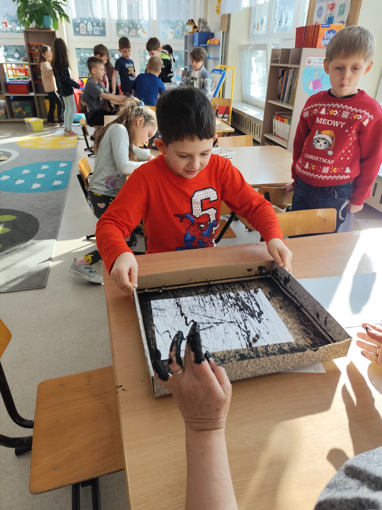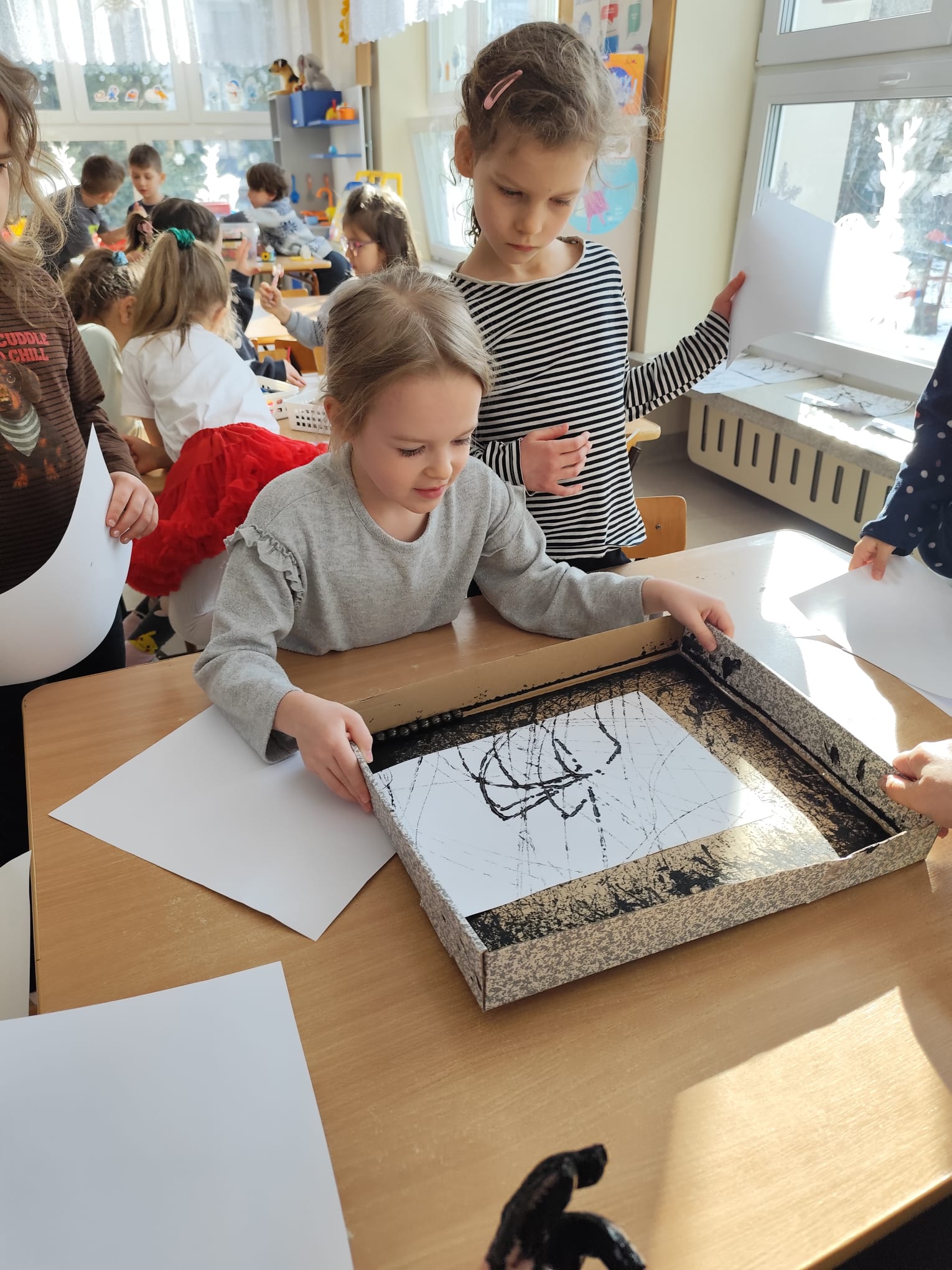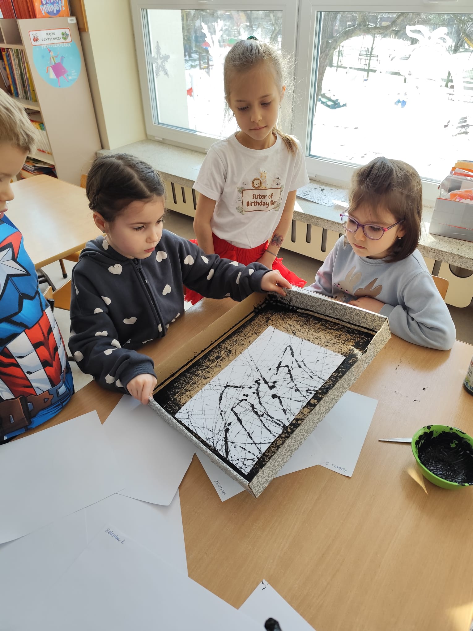 Przy pomocy metalowych kulek, kartonowego pudełka oraz czarnej farby, dzieci poznały nowa technikę plastyczną.